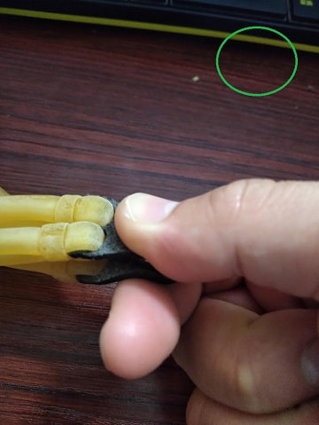 玉を持つときは人差し指の第一関節辺りに玉を乗せ、親指で挟み込むよう持ちましょう。以下の写真のように、この時決して弾受けで球を包み込むような持ち方はしないようにしましょう。この持ち方をすると、弾受けを離した際に指がゴムの動きに影響を与えるので、狙い通りの場所には飛びません。