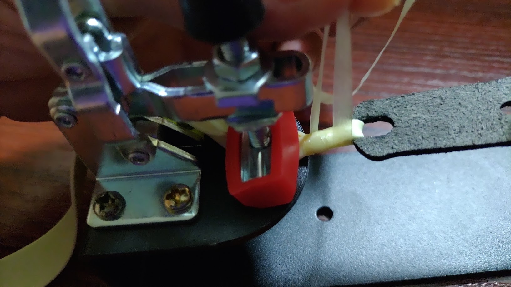 ゴム固定用ジグでゴムを固定し(レバーをパチンと音がするまで引いてください。固いので強めに引いてください。)、もう一方のL字の金具を弾受けの中心の穴に通しゴムを引きます。